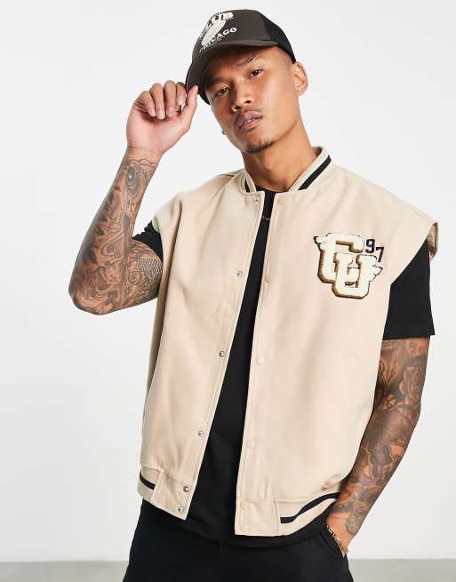 ASOS DESIGN – Beżowy bezrękawnik w stylu varsity z imitacji wełny