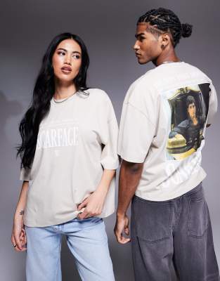 ASOS DESIGN – Beżowy sprany T-shirt oversize unisex z licencjonowanym nadrukiem Scarface