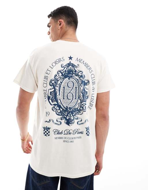 ASOS DESIGN – Beżowy T-shirt o luźnym kroju z nadrukiem z tarczą na plecach