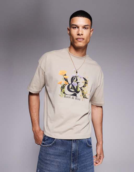 ASOS DESIGN – Beżowy T-shirt o pudełkowym kroju oversize z nadrukiem kwiatowym z przodu