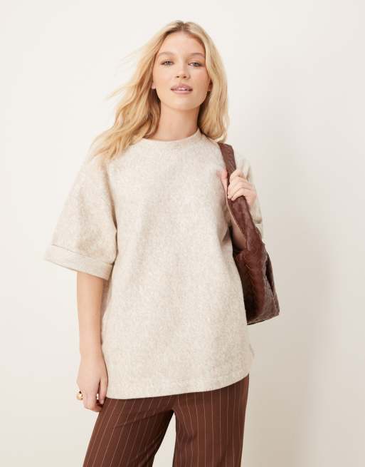 ASOS DESIGN – Beżowy T-shirt oversize z dzianiny boucle z wywiniętymi mankietami