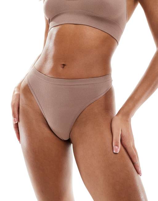 ASOS DESIGN – Bezszwowe prążkowane stringi w kolorze mokka