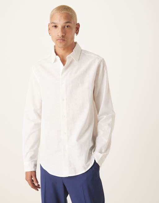 ASOS DESIGN – Biała elegancka koszula o regularnym kroju z okrągłym kołnierzykiem z domieszką lnu
