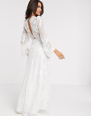 ASOS DESIGN – Biała haftowana suknia ślubna z obszernymi rękawami z obcisłym mankietem