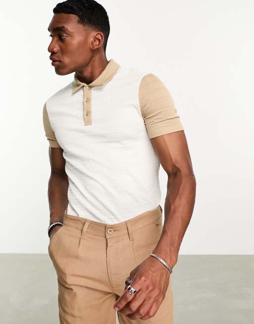 ASOS DESIGN – Biała koszulka polo z beżowymi wstawkami i kontrastowymi rękawami