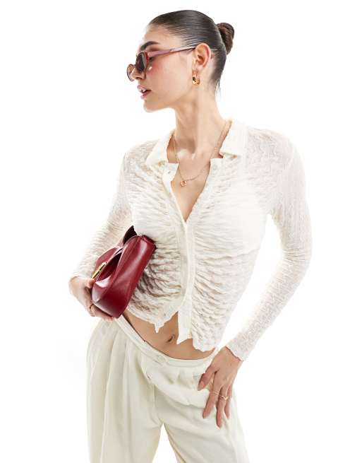 ASOS DESIGN – Biała marszczona koszula z fakturowanej siateczki