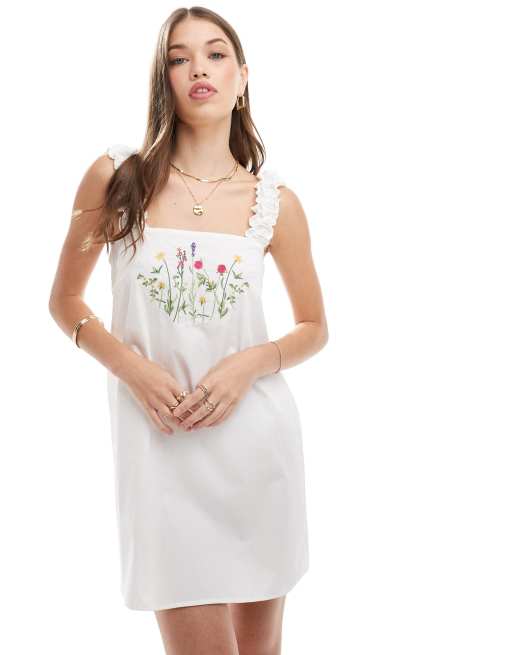 ASOS DESIGN – Biała popelinowa sukienka z krótkimi rękawkami w haftowany wzór