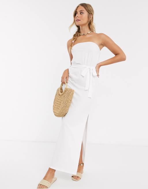 ASOS DESIGN – Biała sukienka maxi z dekoltem typu bandeau i paskiem