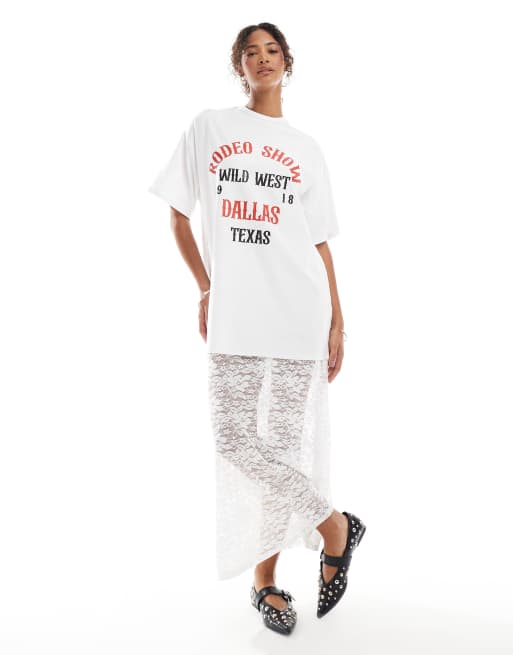 ASOS DESIGN – Biała sukienka T-shirtowa midi 2 w 1 z grafiką i koronkowym dołem