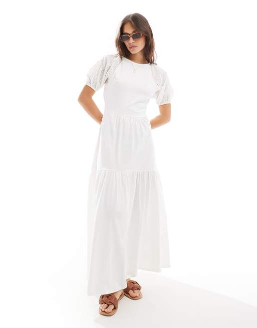 ASOS DESIGN – Biała warstwowa sukienka maxi z haftem angielskim i bufkami