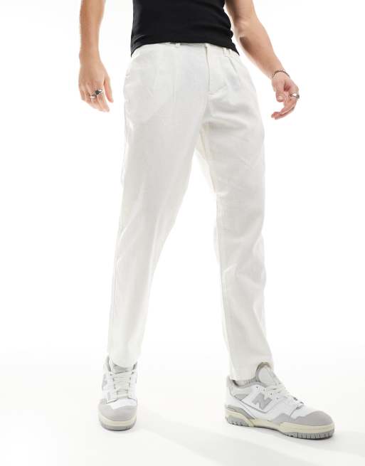 ASOS DESIGN – Białe, dopasowane chinosy z zakładkami, z domieszką lnu