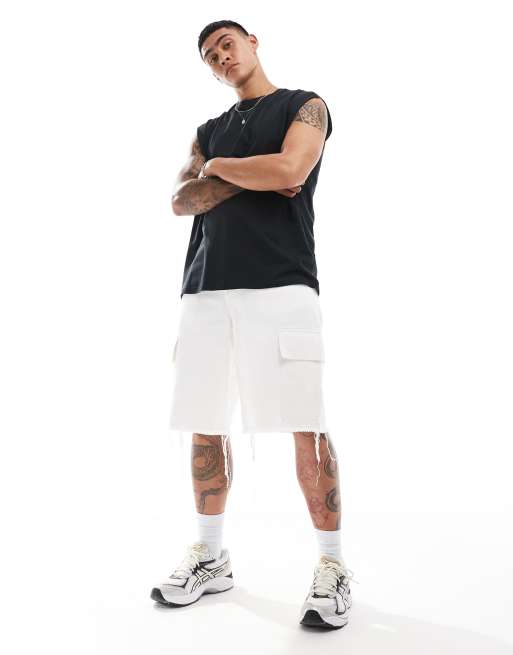 ASOS DESIGN – Białe długie jortsy jeansowe z kieszeniami cargo i surowym wykończeniem