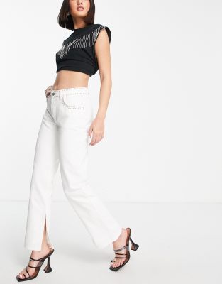 ASOS DESIGN – Białe jeansy z prostymi nogawkami, średnim stanem i dżetami