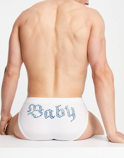 ASOS DESIGN – Białe slipy kąpielowe z napisem z kryształków