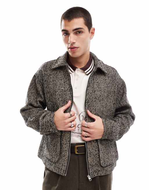 ASOS DESIGN – Biało-brązowa kurtka harrington oversize z domieszką wełny