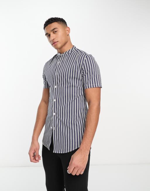 ASOS DESIGN – Biało-granatowa koszula o obcisłym kroju ze stójką i podwiniętymi rękawami w paski