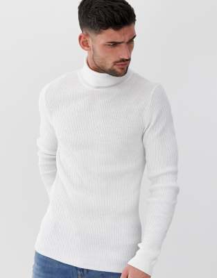 ASOS DESIGN – Biały prążkowany sweter z odwijanym golfem o kroju podkreślającym sylwetkę