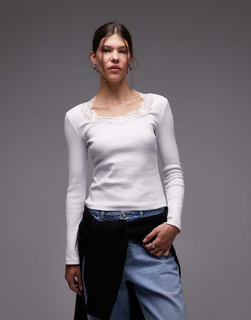 ASOS DESIGN – Biały prążkowany top z wykończeniem z koronki i dekoltem w kształcie serca