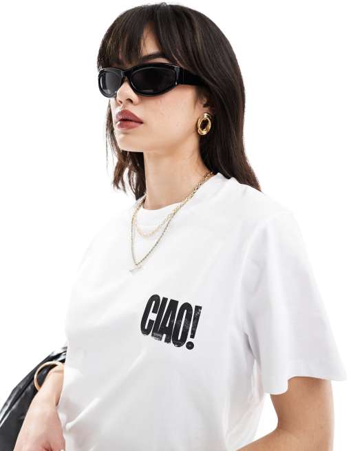 ASOS DESIGN – Biały T-shirt o regularnym kroju z grafiką „Ciao“ na piersi