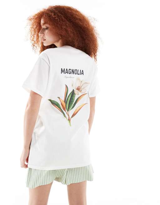 ASOS DESIGN – Biały T-shirt oversize z grafiką z motywem magnolii na plecach