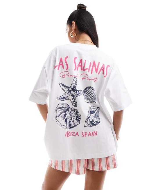 ASOS DESIGN – Biały T-shirt oversize z grafiką z muszlami i napisem Ibiza