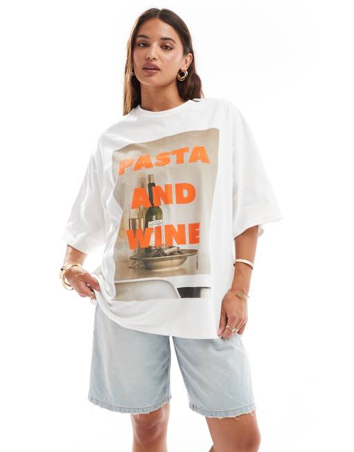 ASOS DESIGN – Biały T-shirt oversize z grafiką z napisem Pasta And Wine