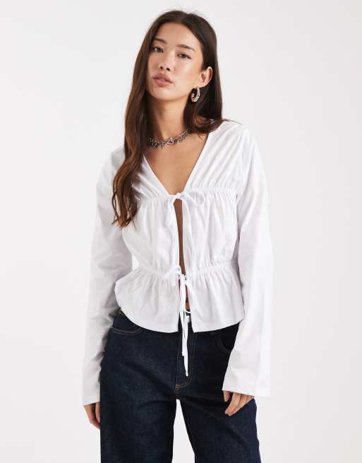 ASOS DESIGN – Biały T-shirt z długimi rękawami i wiązanymi wstawkami