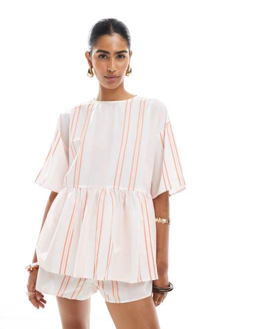 ASOS DESIGN – Biały top oversize z krótkimi rękawami i baskinką w pomarańczowe paski, część zestawu