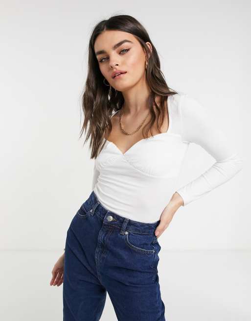 ASOS DESIGN – Biały top z długim rękawem, dekoltem w kształcie serca i marszczeniami na biuście
