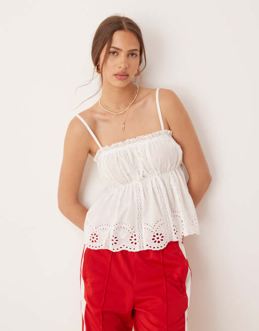 ASOS DESIGN – Biały warstwowy top na ramiączkach z koronkowymi wstawkami i haftem angielskim