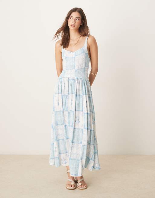 ASOS DESIGN – Bladoniebieska gnieciona sukienka midi z dekoltem w kształcie serca w pocztówkowy wzór