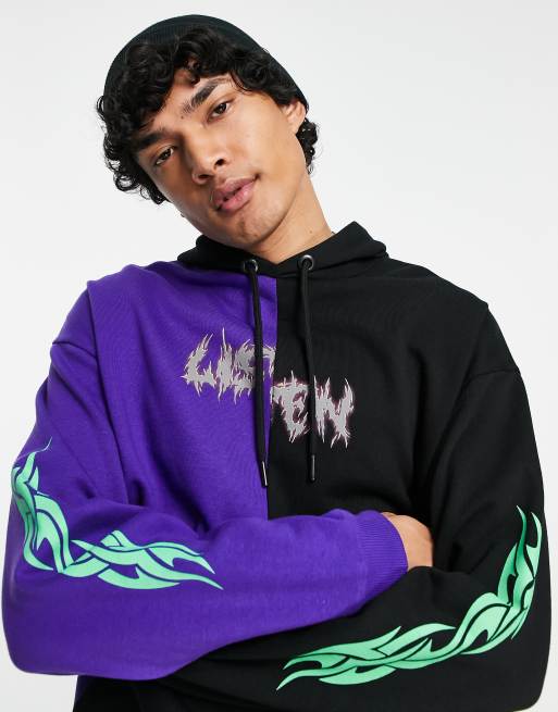 ASOS DESIGN – Bluza oversize z kapturem i blokami kolorów: fioletowy i czarny z nadrukiem w stylu tatuażu