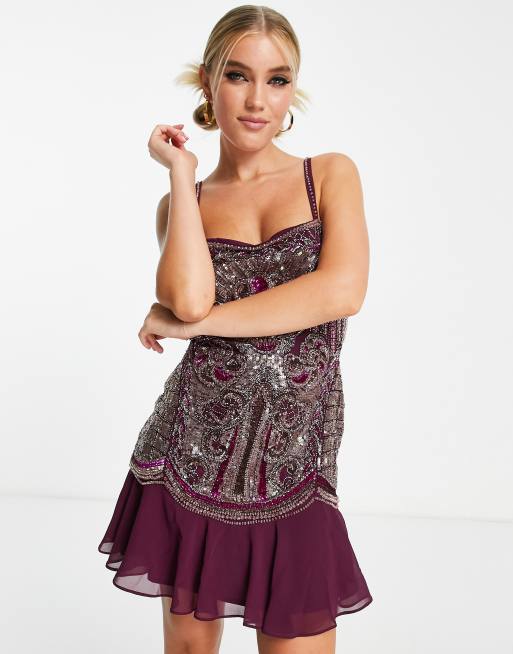 ASOS DESIGN – Bogato zdobiona śliwkowa sukienka mini na ramiączkach z falbanką na dole