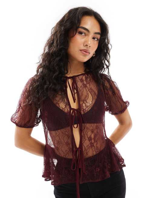 ASOS DESIGN – Bordowa koronkowa bluzka z wiązaniem z przodu