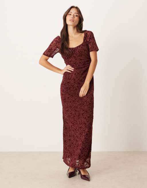 ASOS DESIGN – Bordowa koronkowa sukienka midi z bufkami we wzór devore