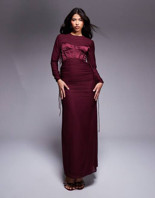 ASOS DESIGN – Bordowa marszczona sukienka maxi z długimi rękawami i satynową gorsetową wstawką