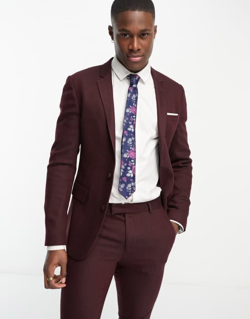 ASOS DESIGN – Bordowa marynarka o bardzo obcisłym kroju z mieszanki wełny w jodełkę