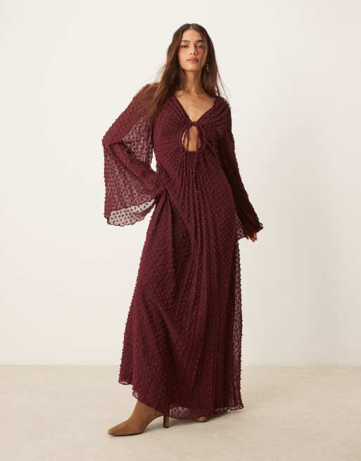 ASOS DESIGN – Bordowa plisowana sukienka midi z tkaniny dobby z wiązaniem z przodu