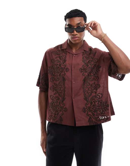 ASOS DESIGN – Bordowa pudełkowa koszula oversize z kołnierzykiem kubańskim i haftowanym wzorem