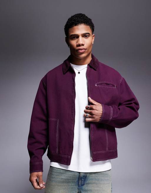 ASOS DESIGN – Bordowa pudełkowa kurtka Harrington oversize ze sztruksowym kołnierzem i kontrastowym szwem