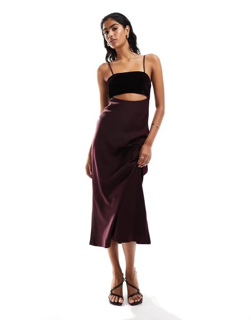 ASOS DESIGN – Bordowa satynowa sukienka midaxi z aksamitnym dekoltem i wycięciem