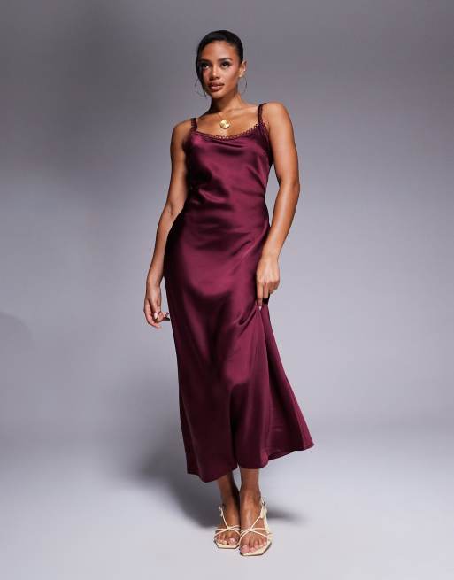 ASOS DESIGN – Bordowa satynowa sukienka midi na ramiączkach z dekoltem obszytym pikotką