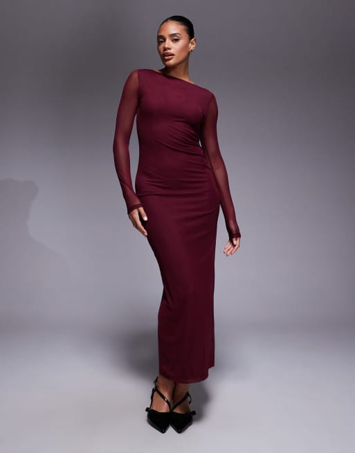 ASOS DESIGN – Bordowa siateczkowa sukienka midi z długimi rękawami