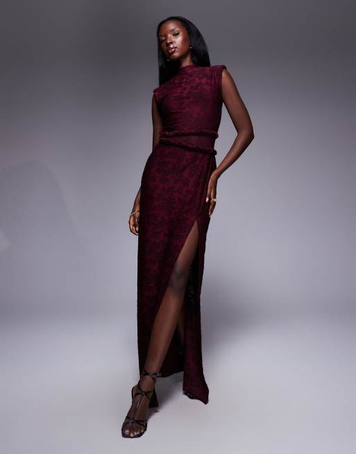 ASOS DESIGN – Bordowa sukienka maxi we wzór devoré z zabudowanym dekoltem, ozdobnym skrętem i prześwitującą wstawką