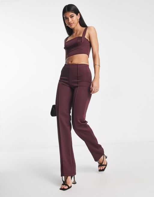 ASOS DESIGN – Bordowe spodnie z tkaniny nurek z prostymi nogawkami i z zaszewkami