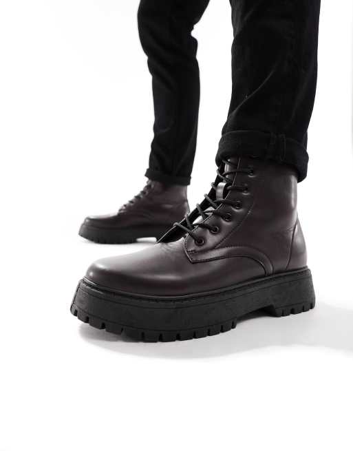 ASOS DESIGN – Bordowe sznurowane buty z wysoką cholewką z imitacji skóry na grubej podeszwie