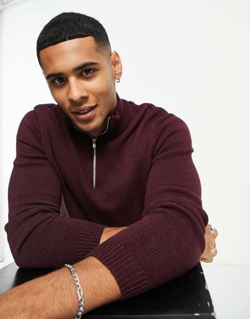 ASOS DESIGN – Bordowy bawełniany sweter o średniej gramaturze z zamkiem pod szyją