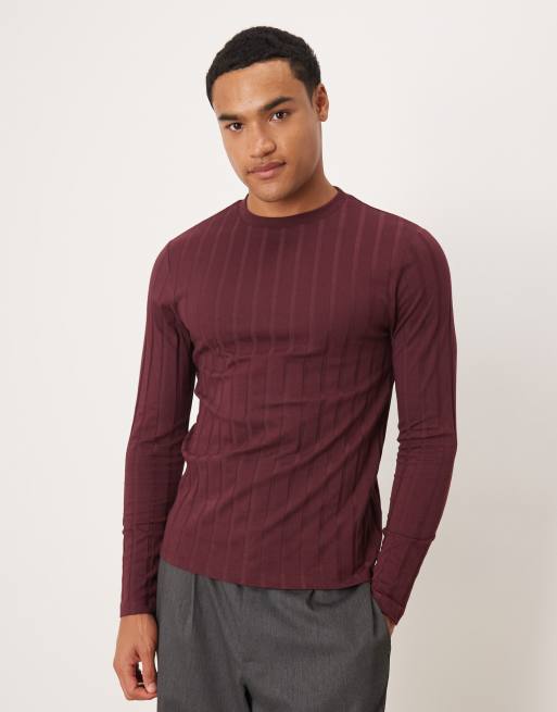 ASOS DESIGN – Bordowy dopasowany T-shirt z długimi rękawami w szerokie prążki