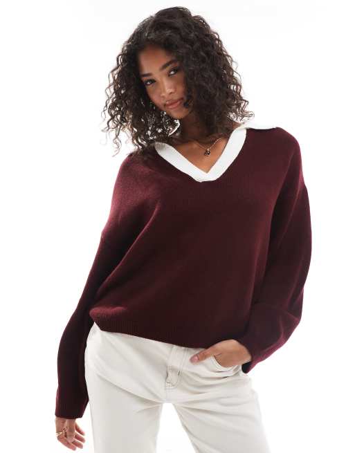 ASOS DESIGN – Bordowy dzianinowy top z kontrastowym kołnierzykiem polo z wycięciem