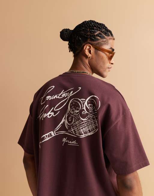 ASOS DESIGN – Bordowy gruby T-shirt oversize ze sportową grafiką na plecach